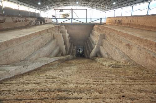 该墓平面为甲字形,是一座带斜坡墓道的多室砖室墓,规模宏大,结构复杂,主要由墓道、墓门、前后室和四个侧室构成。斜坡墓道长39.5米,宽9.8米,最深处距地表约15米,占地面积约740平方米。