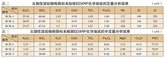 通过测试化验,可以明确的是,安阳北朝晚期墓葬出土的低温铅釉陶器,首先具有10﹪左右的吸水率,远高于商周以降的原始瓷器,更高于同时代及其后代的高温钙釉瓷器,不符合瓷器的基本标准;其次,胎骨原料选用高岭土,而且这种原料与同时期的高温钙釉瓷器基本相似,与使用普通黏土作胎的两汉时期低温铅釉陶器的断面相比显得较为细密,反映出此类器物制作的精美度跨上了一个新的台阶。但同时,胎体的疏松度、孔隙率以及杂质铁的含量还远远高于同时期的瓷器,说明胎料的深加工依然不够精细,也可以证明虽然都是用高岭土,但低温铅釉陶器和高温钙釉瓷器的生产是有明确区分的。第三,这批产品的釉料中,铅的含量很高,以铅为助溶剂的釉料属性很明确,故烧成温度在963℃~1048℃。釉料中含有不同含量的铜和铁,以铜离子和铁离子呈色的基本原理与两汉时期相较没有变化。据此,判定这批器物属于低温铅釉陶器已无可置疑。