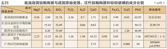 把中国古代低温铅釉陶器出现的时间从西汉中期提前至战国晚期,虽然时间跨度不是特别大,但却具有极为重要的学术意义。为确保对这一误读事件的匡正所具有的有效性,我检索相关测试报告,把临淄战国铅釉陶器与两汉时期的铅釉陶器、战国原始青瓷、汉代铅钡玻璃的化学成分做了一下比对,从而可以更加清晰明了地讨论其釉层的化学属性。具体数据见表四。