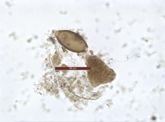 虽然差异不显著,但是相对于北、中区,时间上稍晚的南区墓葬蛔虫感染率还是略高一些。可能由于聚居区军事属性弱化,以及人口密度增加,更有利于寄生虫病的传播。于是随着时间推移,时代较晚的墓葬感染率有所升高。异形吸虫的存在,表明部分墓主有生食鱼蛙等水生动物的经历,多见于北区秦军士兵墓葬,这一现象暗示体力消耗大的秦军士兵除配给的口粮外,可能还会常常捕捉当地的水生动物补充肉食。城阳城址18号墓是与城址相关的战国晚期中下层贵族墓葬,与三门峡大唐电厂秦人墓地时代相当,墓主随葬兵器和大量仿铜陶礼器,代表着当时本地军事将领这一阶层。经实验分析,在城阳城址18号墓的寄生物样品中发现多种寄生虫卵,可确定种属的包括鞭虫卵(Triichuris trichiura)、横川后殖吸虫卵(Metagonimus yokogawai)、华支睾吸虫卵(Clonorchis sinensis)阔节裂头绦虫卵(Diphyllobothrium latum)。