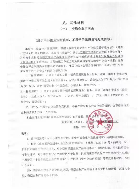 河南省文物考古研究院卢沈高速沈丘至遂平段项城席营遗址考古发掘配合劳务服务; | 河南诺一建设工程有限公司 | 河南省周口市市辖区东新区碧桂园 85 栋 1 单元 902 室 | 99700.00 |