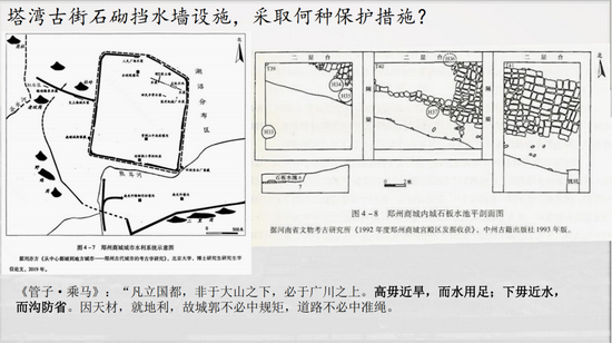河南省文物考古研究院(城市考古与保护基地办公室)杨树刚的报告题目是《个案:郑州商城内城东南水系遗存新发现》。以郑州商城内城东南水系遗存新发现为例,概括性介绍了郑州商城近年城市考古的保护工作实践。郑州商城遗址内城的创新街小学、亳都古巷、塔湾古街、两院二期等项目开展持续多年的考古发掘工作,陆续发现沟渠、石砌挡水墙等遗迹,初步研究认为,新发现的水系遗存作为郑州商城城市水网系统的组成部分,不同项目间沟渠互通互联的可能性很大,具有人工明沟与石砌挡水设施相结合、水流活动走势明显等特点,表明至迟在白家庄期,郑州商城还存在着复杂水网体系。后续的城市水利、地貌环境、石材产地、建筑技术等相关多学科综合研究还在推进。目前,石砌挡水墙等重要节点遗迹已要求原地保护,这必将进一步丰富郑州商城国家考古遗址公园的文化景观。同时,杨树刚对郑州商城现今和未来的保护与利用工作提出展望,希望郑州商城遗址要以国家考古遗址公园的建设为契机,进一步统筹城市文化遗产与城市有机发展之间的关系,为快速城镇化进程中都邑遗址的城市考古与保护工作继续提供理念及方法上的借鉴作用。