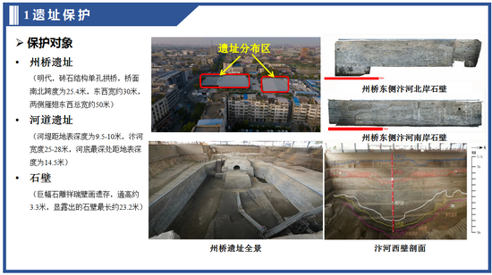 河南省文物考古研究院(城市考古与保护基地办公室)闫海涛的报告题目是《开封州桥遗址整体保护研究思路》。2018年开展了州桥遗址主动性考古发掘工作,发掘面积共4400平米,揭露出汴河河道及其南北两岸、州桥本体等,2022年12月,入选央视“2022年度国内、国际十大考古新闻”。2023年3月,入选“2022年度全国十大考古新发现”。州桥及其河道遗址考古发掘出土后,受埋藏环境的改变、地下地表水浸泡,冻融可溶盐破坏的因素共同作用,已出现了桥体及河道探方结构失稳、土体开裂、坍塌、酥粉、霉菌滋生等各类病害,局部已威胁遗址安全稳定,如不采取保护措施,更无法开放展示。鉴于此,课题组明确了以价值为导向、结构安全稳定为基础、加强前期勘察研究和展示利用结合的保护思路,研究制定了州桥遗址本体保护方案,采用桥体临时支撑、灌浆加固修复桥体开裂、材料加固遗址本体风化酥粉、铅丝石笼坡底加固等探坑坑壁支护措施,实施了局部文物保护工程,取得了预期的保护效果。