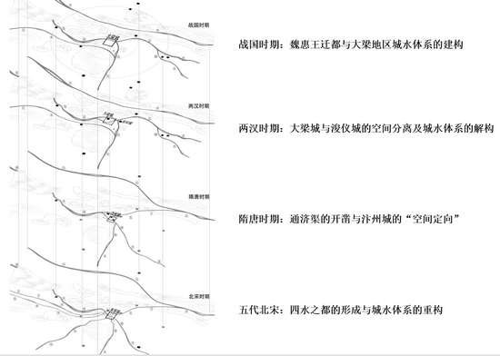 郑州大学白庆韬的报告题目是《“以城寻水,以水观城”—河南隋唐大运河沿线城市历史地理研究》。本研究从中国古代文献对于“河渠”记载方式的特征出发,以历史学与建筑学相结合的研究视角,通过建立“城市锚点”的方式,找寻运河水路的空间脉络,进而探究河南隋唐大运河与沿线城市的历史空间共生关系。通过相关地理分析得出了四个历史时期的城水体系空间图,可概括为,战国时期:魏惠王迁都与大梁地区城水体系的建构;两汉时期:大梁城与浚仪城的空间分离及城水体系的解构;隋唐时期:通济渠的开凿与汴州城的“空间定向”。由分水口的定位及通济渠线路而形成的“空间定向”,李勉的汴州城扩建而使汴州城再次形成贯穿型城水格局;五代北宋:四水贯都的形成与城水体系的重构。不再侧重于城市圈层的构架,通过水路的汇聚而形成更大范围内的中心性加强。