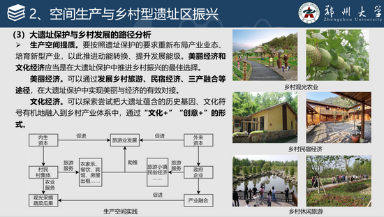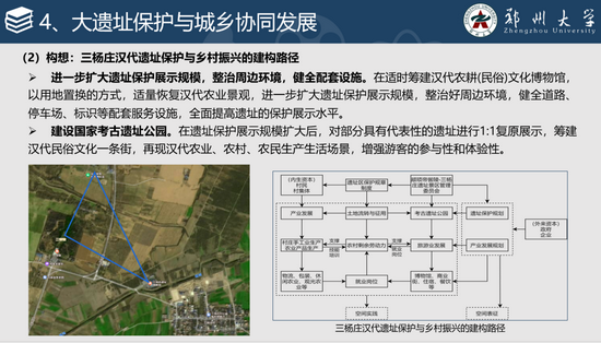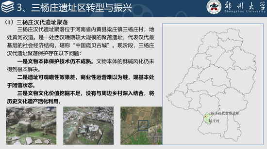 郑州大学田从争的报告题目是《大遗址保护与城乡协同发展模式研究设想—以三杨庄遗址为例》。报告分为四个部分,第一部分是大遗产保护与乡村发展,政府近年来十分重视大遗址保护和利用且乡村振兴是实现大遗址可持续保护的重要支撑,而大遗址区乡村转型发展也是实现国家乡村振兴战略的重要实践,大遗址保护与乡村发展具有深入挖掘和传承历史文化等较为重要的研究意义。但其仍面临着一些现实困境,例如保护与发展的矛盾,遗产保护与经济效益的冲突。第二部分是空间生产与乡村型遗址区振兴,分析了大遗址保护与乡村发展的路径。第三部分是三杨庄遗址区转型与振兴,现阶段,三杨庄汉代遗址聚落保护存在一些问题,针对四个方面的研究内容进行详细分析,探讨三杨庄遗址区的转型与振兴。最终通过相关案例展示分析,构想三杨庄汉代遗址保护与乡村振兴的建构路径,通过实施文化空间、生态空间、经济空间和社会空间上的协同措施来促进大遗址保护与城乡协同发展。