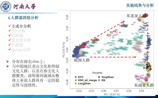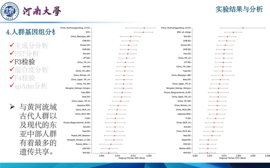 河南大学历史文化学院武喜艳作了题为《河南三门峡地区虢国人群基因组研究》的报告。虢国是周朝立国前后分封的重要姬姓封国,在两周历史上占有重要的地位,同时也是两周时期社会动荡及人群流动的直接反映。然而,由于缺乏详细的历史记载和分子考古研究,目前对于虢国东迁后的人群遗传特征以及虢国被晋国灭亡后虢人的去向问题尚不清晰。该研究以与东迁后的虢国直接相关的考古遗址(包括李家窑遗址和义马上石河墓地)的人骨材料为研究对象,进行了 DNA 研究。研究发现李家窑遗址和上石河墓地人群均具有较高的母系遗传多样性,包括单倍型 A、B、C、D4、D5、G、M32 和 N9 等。另外,研究发现两个遗址有着明显不同的父系遗传特征,李家窑遗址的父系单倍型以O 为主,而上石河墓地人群则以 N 和 Q 为主。此外,通过常染色体基因组研究发现,李家窑遗址和上石河墓地人群在遗传结构上有着明显的差异,上石河墓地人群(埋葬方向为南北向的墓葬)与古代黄河流域人群,尤其是与陕西五庄果梁遗址和石峁遗址的古代人群有着非常近的遗传关系,暗示了该人群可能起源于陕西一带,相比于上石河墓地人群,李家窑遗址人群受到更多类东亚南部的遗传影响。总之,本研究为虢国被灭国后虢人的去向提供了有力的证据,也为了解两周时期复杂的人群流动和虢人的遗传历史提供了重要的数据支撑。