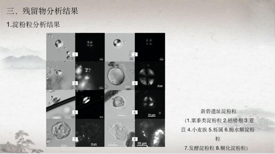 河南大学历史文化学院刘春洋作了题为《新密新砦遗址新砦期陶器残留物分析和研究》的报告。通过对新砦遗址新砦期出土的部分陶器进行残留物分析,观察到淀粉粒、植硅体和与酿酒有关的菌类,确定了部分陶器的用途。与已知的淀粉粒、植硅体形态对比可知,本次分析发现的农作物种类有粟黍类、小麦族、水稻,非农作物种类有栝楼根、薏苡、栎属,表明新砦遗址新砦期是旱稻混作的农业经济模式,且以旱作农业为主。栝楼根和栎属等植物的发现,反映出这一时期先民获取植物性食物资源的方式兼有农业种植和采集。另外,部分陶器标本观察到发酵损伤的淀粉粒和酵母细胞,说明这一时期新砦遗址的先民已掌握了酿酒技术。本次研究成果为新砦遗址新砦期陶器功能、农业结构、生业模式等问题的研究提供了新的数据支持。