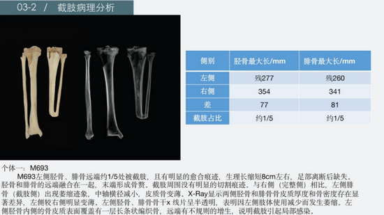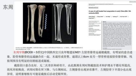 郑州大学考古与文化遗产学院刘艳梅作了题为《东周时期刑罚和医疗制度背景下的惩罚性截肢》的报告。截肢是创伤处理或医疗过程中的外科手术,也是一种惩罚性的肉体减刑,下肢减少会导致行动能力丧失和羞耻感。利用生物考古学方法对河南省三门峡甘棠遗址出土的两例具有下肢截肢迹象的个体进行了研究,以调查截肢对骨骼的影响以及可能的患者护理和截肢事件的情况。M693左侧下肢截肢,M432 右侧下肢截肢。宏观观察和图像分析表明愈合和功能适应。随葬品和同位素分析表明这两个人具有相对较高的社会经济地位。据推测,M693 和 M432 因重罪而受到惩罚性截肢,与周朝刑罚制度中法律和刑罚的历史文字记录相一致。被惩罚后,这两个人得以康复并在良好的照顾下继续生活多年。这些研究丰富了我们对下肢截肢的身体后果以及古代社会背景下惩罚性截肢现象的理解。