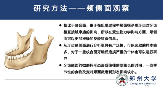 郑州大学考古与文化遗产学院付清鑫作了题为《中国古代农业人群与农牧混合人群臼齿颊侧面微磨耗形态的比较》的报告。为探讨不同生业模式人群饮食结构差异在牙齿微磨耗上的表现,本文使用超景深显微镜对郑州汪沟遗址和大同金茂园遗址出土的85例个体的下颌第一臼齿颊侧面进行了微磨耗形态观察。结果显示,两组人群在臼齿微磨耗形态存在显著性差异,以农业经济为主的汪沟人群臼齿颊侧面条痕均数为36.95条,条痕均长为236.89μm,水平与垂直平均条痕长度比值平均为120.89%,农牧混合经济下的金茂园组条痕均数28.26条,条痕均长262.55μm,两长度比值平均为83.51%。相比金茂园组,汪沟组人群臼齿颊侧面微磨耗特征存在条痕长度短,密度高,两长度比值较高的现象,表明不同的饮食结构会造成不同的臼齿颊侧面微磨耗形态。