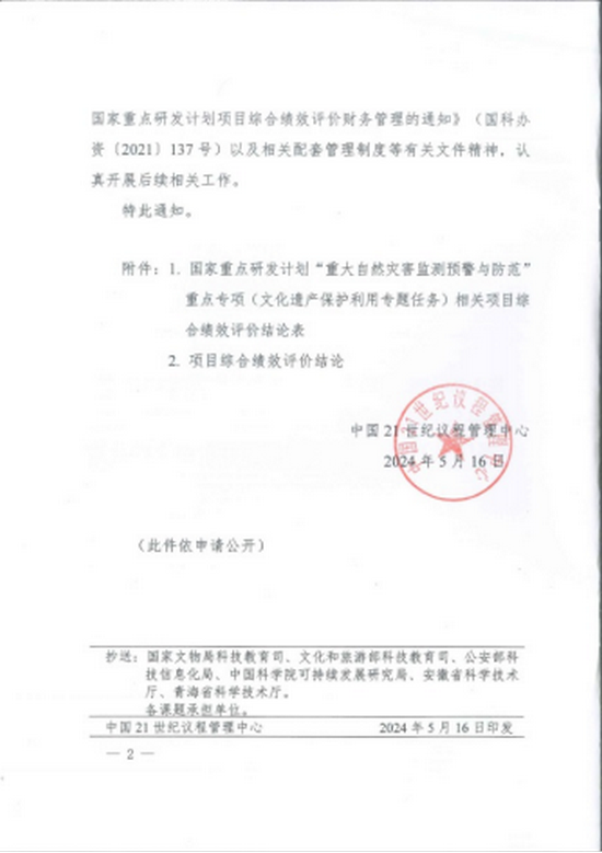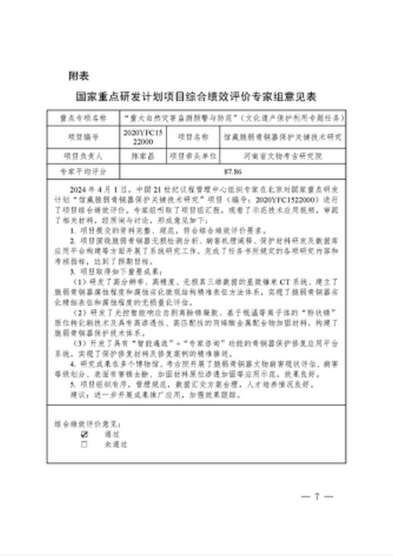 2024年5月16日,由我院牵头承担的国家重点研发计划“重大自然灾害监测预警与防范”专项(文化遗产保护利用专题任务)“馆藏脆弱青铜器保护关键技术研究”(项目编号:2020YFC1522000)项目,经过严格综合绩效评价考核,顺利通过中国 21 世纪议程管理中心评审验收。项目于2020年正式批准立项,我院陈家昌副院长为项目负责人,总经费共计1217.87万元,其中国家重大专项资金870万元,项目执行周期为2020年10月至2023年9月。项目由河南省文物考古研究院牵头,联合西北大学、中国人民解放军战略支援部队信息工程大学、郑州大学、武汉科技大学、中国科学技术大学等10家单位组成。