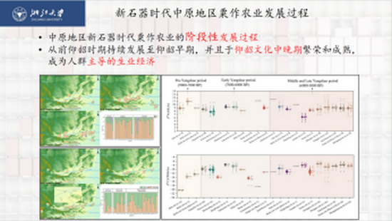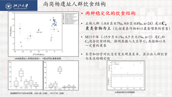 浙江大学艺术与考古学院邓陈作了题为《新石器时代(9000-5000BP)中原地区的粟作农业和社会复杂化:尚岗杨遗址人群饮食的同位素重建》的报告。此次报告基于中原地区仰韶中晚期尚岗杨遗址的人骨同位素证据,揭示尚岗杨人群主要摄入粟黍类食物并发展粟作农业。其次,整合分析新石器时代已公开发表的21处考古遗址的506个人骨同位素数据,首次从同位素视角直接性揭示中原地区人群饮食的阶段性特征——从前仰韶时期时期在整体性缓慢偏向于C4粟黍类食物,且也呈现出由仰韶早期部分人群消费C4粟黍类食物到仰韶中晚期整体人群普遍消费C4粟黍类食物的转变。再者,结合新石器时代的植物浮选和动物考古研究成果,以全面把握人群生业模式历时性演变轨迹,发现粟作农业发展存在阶段性特征,从前仰韶时期持续发展至仰韶早期,并且于仰韶文化中晚期繁荣和成熟,成为人群主导的生业经济。最后,发现仰韶文化中晚期粟作农业发展和社会发展都具有相似的阶段性特征,粟作农业主导地位的确立与仰韶中晚期社会复杂化进程加快基本同步。因此,以粟作农业为核心的生业经济不仅在整体上加速中原地区社会复杂化过程中发挥了重要作用,而且为中原核心区早期文明的出现提供了坚实的经济基础。