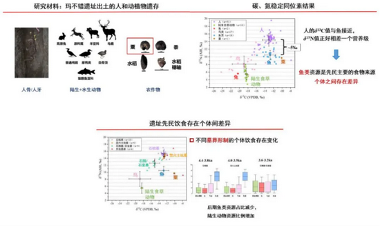 中国科学院青藏高原研究所黄蕴哲作了题为《基于稳定同位素重建西藏玛不错遗址先民食谱及演变》的报告。碳、氮稳定同位素食谱分析方法基于“我即我食”的原理构建,于上世纪80年代引入国内,已应用于国内数百个遗址点。但目前对人类在极端环境下的饮食研究尚少。青藏高原高寒缺氧,环境恶劣,不适宜人类生存。但现有考古证据表明高原人类活动历史至少已有20万年。但由于考古资料有限,是什么食物支撑了早期狩猎采集人群在高原的生存尚不清晰。超高海拔地区的西藏康马玛不错遗址,年代跨度距今4400-3000年,出土了大量人骨和动植物遗存,该研究将碳、氮稳定同位素食谱分析方法应用于这些生物遗存,发现鱼类资源在先民饮食中一直占据主要地位,但后期可能由于家养动物和大麦的传入,食谱中的鱼类资源比重下降,陆生资源比重上升。