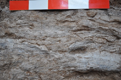 目前已探明储粮仓窖90多座,皆口大底小,圆形;口径8~14米左右;深约2.5~5米。仓窖排列基本整齐有序,排与排间距10米左右;窖与窖间距3.5~10米。目前发掘清理了3座仓窖,其中C6窖口直径约12米,窖口至窖底深3.2米;窖口周围清理出有柱础遗迹。经过对窖内近底部残存的粮食遗存初步检测分析,为带颖壳的粟、黍及豆等。