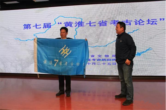 黄淮七省考古论坛于2011年开始举办,旨在推动黄淮流域各省文物保护和考古研究工作的互动交流、加强区域考古合作,迄今为止已经举办七届。根据论坛计划,2018年度第八届论坛将在河南举办。10月25日下午本届论坛闭幕式上举行了会旗交接仪式,刘海旺院长从这届主办方代表手中接过会旗,河南省文物考古研究院将作为下一届论坛的主办方开始组织筹备工作。