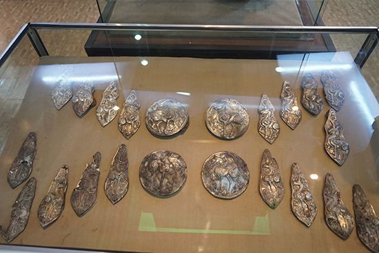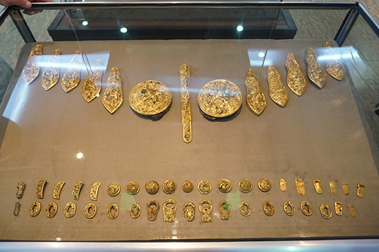 博物馆很小,里面陈列了几十年来考古学系师生的工作成果。当然是以高勒毛都2号墓地M1及其陪葬墓群出土遗物为主。正中间的三个展柜分别陈列着M1主墓葬出土的成套金银车马器、玉器以及陪葬墓出土的罗马玻璃碗。