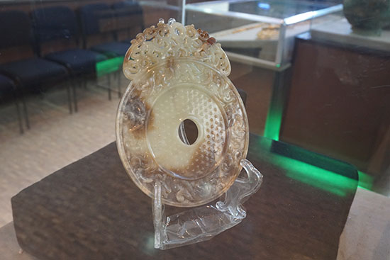 除了夺目的金银器之外,再就是那只蓝白相间的罗马玻璃碗。这只碗出土于最大的一座陪葬墓中,是典型的罗马器物。在欧美的博物馆中都能见到造型和花纹高度相似的器物。至于这只产自欧亚大陆另一端的玻璃碗是如何来到亚洲北部大草原的深处,这显然是跟丝绸之路有关联,蒙古学者也正在就此进行研究。玻璃碗的旁边是一件直径18.5公分的汉代玉璧。保存如此完好的汉代玉璧连我们长期在中国从事汉代考古的专家都十分惊讶,我们跟教授开玩笑说,这件玉璧漂亮的让人难以置信。教授介绍说,这件玉璧的发现十分幸运——安放人骨的棺室被盗掘一空,这块玉璧因为紧贴棺壁而逃过一劫。