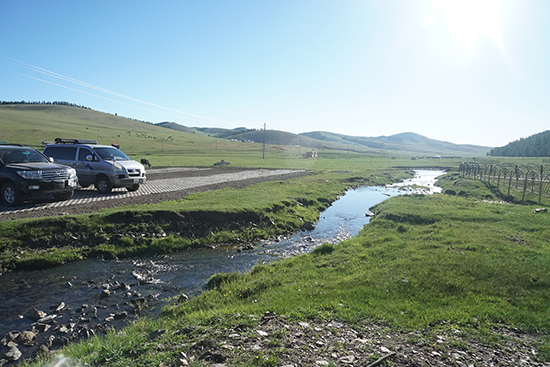 中午时分抵达后杭爱省省会,停下来对汽车进行简单维护并吃饭。随后在公路上行进六七十公里之后,再次进入完全没有路的草原。经验丰富的司机根据地面情况准确的切换着二驱、四驱模式,车在小树林和河沟之间任性的颠簸穿行,有惊无险的穿过一片片沙地和一条条河沟。教授则拿着GPS,指挥着方向。到下午六点左右,终于到达目的地。
