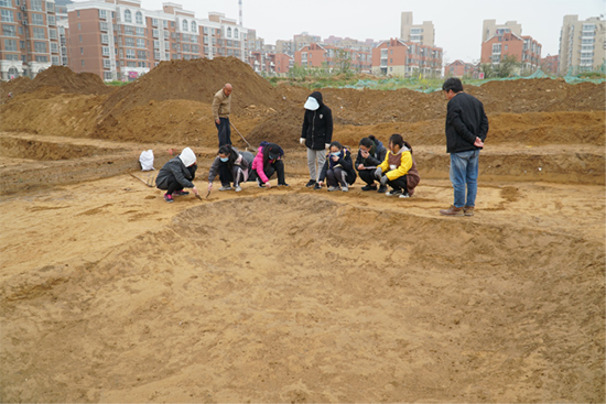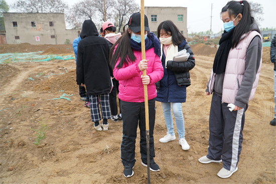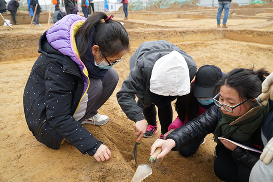 田野考古体验是这次活动的重点,学生们在新郑壹品蓝湾东周遗址进行田野考古体验,由工地负责人樊温泉研究员讲解,包括层位学的原理,以及手铲和洛阳铲等考古工具的使用。同学们分为两个小组,分别在两个探方中进行,严格遵守规则,听从工作人员的指导,亲身体验考古发掘工作。虽然当天天气寒冷但同学们的兴奋好学心情高涨,当大家离开探方时,才发现裤子膝盖位置都是黄色的泥土。