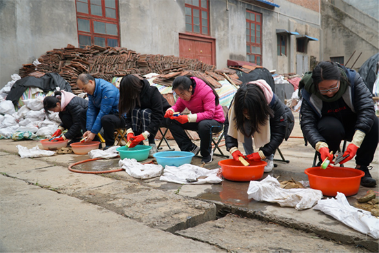随团的郑老师亦参与清洗陶片