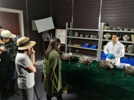 在信阳城阳城址资料整理现场,台湾久艺传播有限公司来拍摄《客心熟语》宣传片,讲述客家人用梅子的历史,其中有城阳城址战国时期楚墓出土梅核的素材。蓝万里博士讲解了战国楚墓梅核发现的概况,并对用梅的历史和先秦礼制做了阐释。