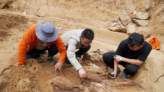 墓室和墓道内填满粉沙及石块,在距离顶部1.8米深度放置有1架马车和12个马头骨。马头骨位于墓圹北边偏东位置,南北两排整齐放置,北部12个,南部3个。清理过程中,在放置马头骨的区域还发现有肋骨和其它部位骨骼。提取马头之后发现每个头骨下面还有1-2个趾骨。