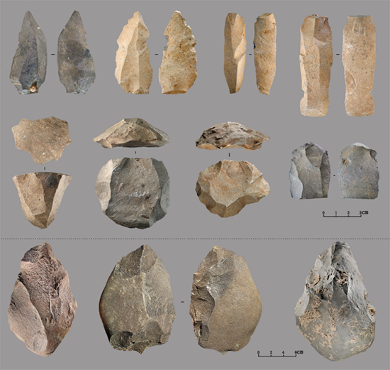 (石叶石核、手斧、砍砸器、石叶、勒瓦喽哇技术制作的石核、石片、尖状器)