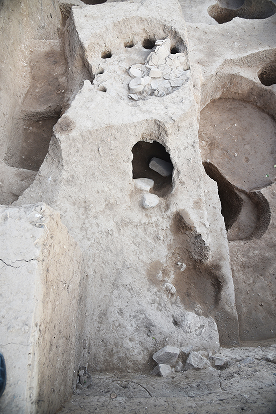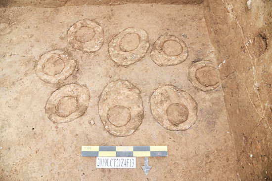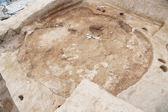 西周早期文化遗存集中发现于遗址西北部,发掘面积3400平方米,发掘遗迹有房址、陶窑、墓葬、道路、灰坑等。其中房址25座,结构保存较好,大多保留有门道、灶、壁龛和踩踏面。灶一般位于房内左侧,结构完整,有火门、火塘、灶台和烟道组成,部分陶灶附近还留存有陶罐、鬲等生活用器。此外,还发现西环壕和北环壕各一段,以及与西环壕大致平行的道路一条,并且路面铺设有鹅卵石。