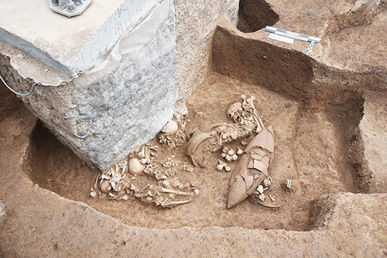 在南城门内早期道路上发现有车辙痕迹,宽0.1~0.15米,深0.12米,最明显的一条长达3.3米。其中一组基本平行的车辙间距0.8米,可能为“双轮车”的车辙印迹。碳十四测年数据显示,这些车辙痕迹的绝对年代不晚于距今4200年,是我国年代最早的“双轮车”车辙痕迹,将我国用车的起源提前了500年。平粮台城址还出土了一批具有多元文化背景的重要遗物。发现的玉冠饰残片,其形状和加工特征与湖北后石家河文化、海岱龙山文化的同类器物近似。陶碗表面刻画的对称复杂兽面纹,与长江流域的玉器纹饰在结构和表现方式上颇为接近。此外,利用黄牛骨进行占卜、祭祀和制作骨器的现象十分普遍。黄牛是龙山时代进入中原的家畜新品种,在平粮台龙山城址的大量发现,对研究起源于西亚地区麦作传统下的黄牛如何融入中原传统的粟黍农业经济体系具有重要意义。